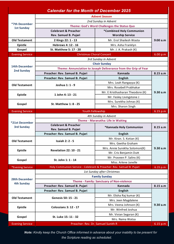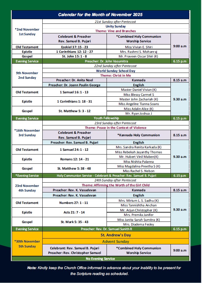 A committed Steward Leadership collectively envisions our ideas, policies, programs and projects. Our goal to reach everyone with God’s love, and our work among Children, Youth, Women, Young Couples, Elderly, the poor, the needy and Professionals’, echo foundations of Christian faith and practice. Our work outside with St. Andrew’s School and Rural work at Tubagere are symbols of empowerment for people in the margins. Celebrating Music in Worship Services, Concerts and learning, continue to celebrate the creative legacy inherited by us. Care is inherent to our vision and the partnership of Steward Leadership is supported by Care Group Leaders in about 40 geographical zones in the city, who are bridge-builders in our ministry of extending care and compassion.