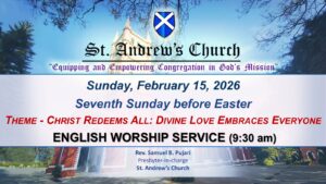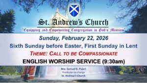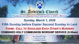 Our life and work at St. Andrew’s, true to the life of the Patron Saint, is a ministry carried out with humility, sincerity and commitment, with no personal glory to any human being but only to God. We celebrate meeting together and encourage one another (Hebrews 10:25).